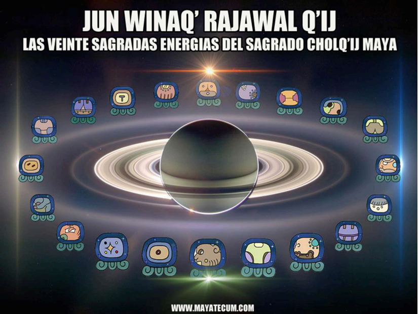 El nacimiento de los veinte Nawales, del mes sagrado Maya de veinte días, según la educación oral de nuestros sabios y documentos antiguos nos dice: Cuando despertó el Mundo, antiguamente nacieron los nawales de los días, del mes de veinte. Este es el origen, dijo Oxlajuj Oc, él de los trece pies; sucedió que emparejó sus pies y partieron del oriente donde nace el abuelo Sol. Nacido el mes, creó lo que se llama “Día” y creó lo que se llama “Cielo y Tierra”, por escala: Agua, Tierra, Piedras, Árboles y Animales. En el Jun B’atz’ sacó de sí mismo su divinidad e hizo el cielo y la tierra. En el Kieb’ B’e hizo la primera escalera para bajar en medio del cielo y en medio del agua. No había tierra, ni piedras, ni árboles. En el Oxib’ AJ hizo todos los seres, la muchedumbre de los seres, los elementos de los cielos y los elementos del mar y de la tierra en abundancia. En el Kejeb’ I’X sucedió que se inclinaron uno sobre otro en el cielo y en la tierra. En el Job’ Tz’ikin sucedió que llegó la riqueza, porque empezó a trabajar todo. En el Waqib’ Ajmaq sucedió que hizo la primera luz y así fue que se hizo la claridad donde no había sol ni luna. En el Wukub’ N’oj sucedió que hizo la sabiduría, la ciencia, la inteligencia y el conocimiento. En el waqxaqib’ Tijax afirmó sus manos y sus pies y los sembró sobre la tierra. En el B’elejeb’ Kawoq se ensayó por primera vez los rayos y las tempestades. En el Lajuj Ajpú sucedió el anuncio de la claridad y se ahuyentó la obscuridad. En el Junlajuj Imox sucedió que hizo las piedras y los árboles. Eso hizo. En el día Kab’lajuj IQ’ sucedió que creó el viento. Y esta es la causa de que se llame IQ’, Gran Espíritu, porque no hay muerte dentro de él. En el Oxlajuj Aq’ab’al sucedió que tomó agua y mojó la tierra y labró el cuerpo de la gente.